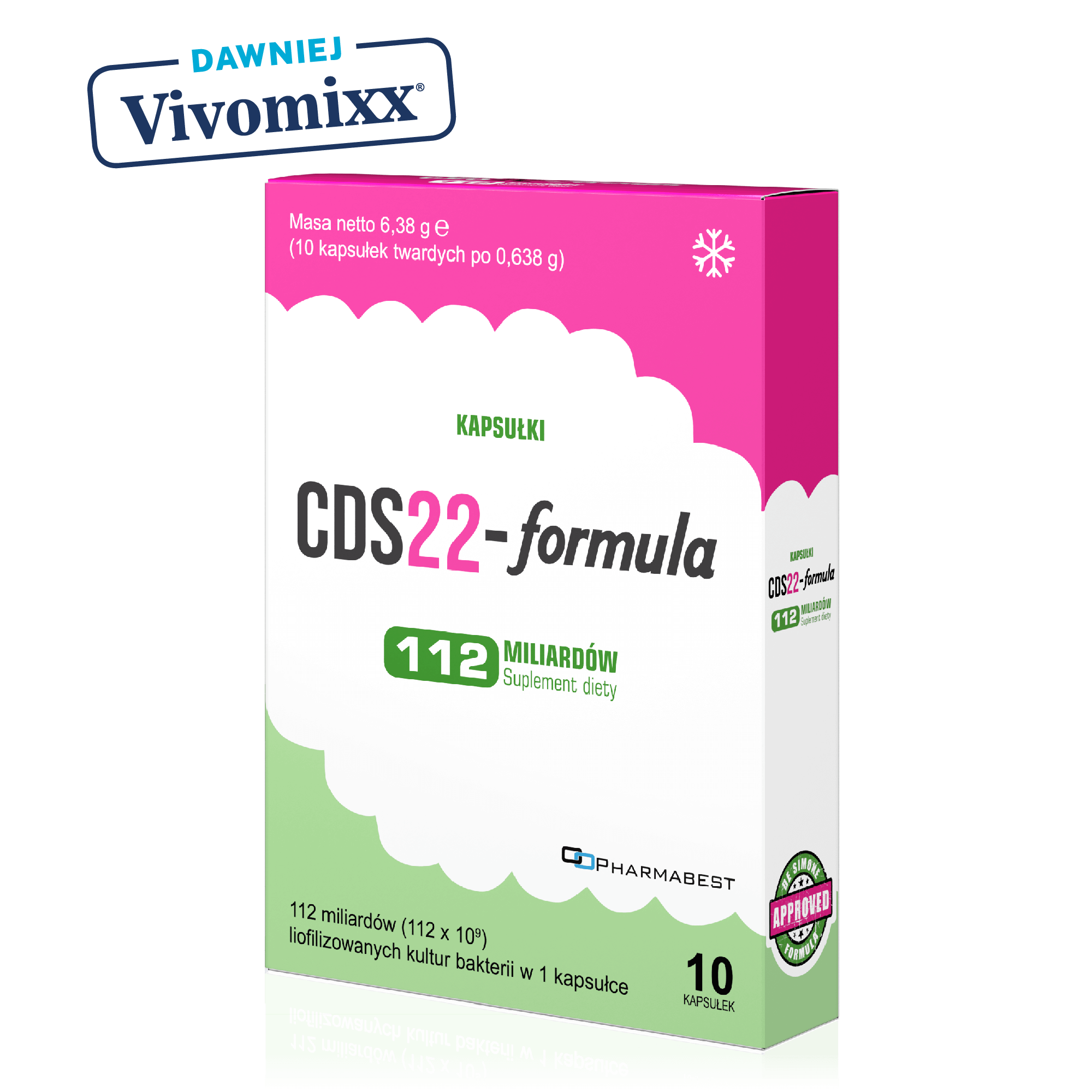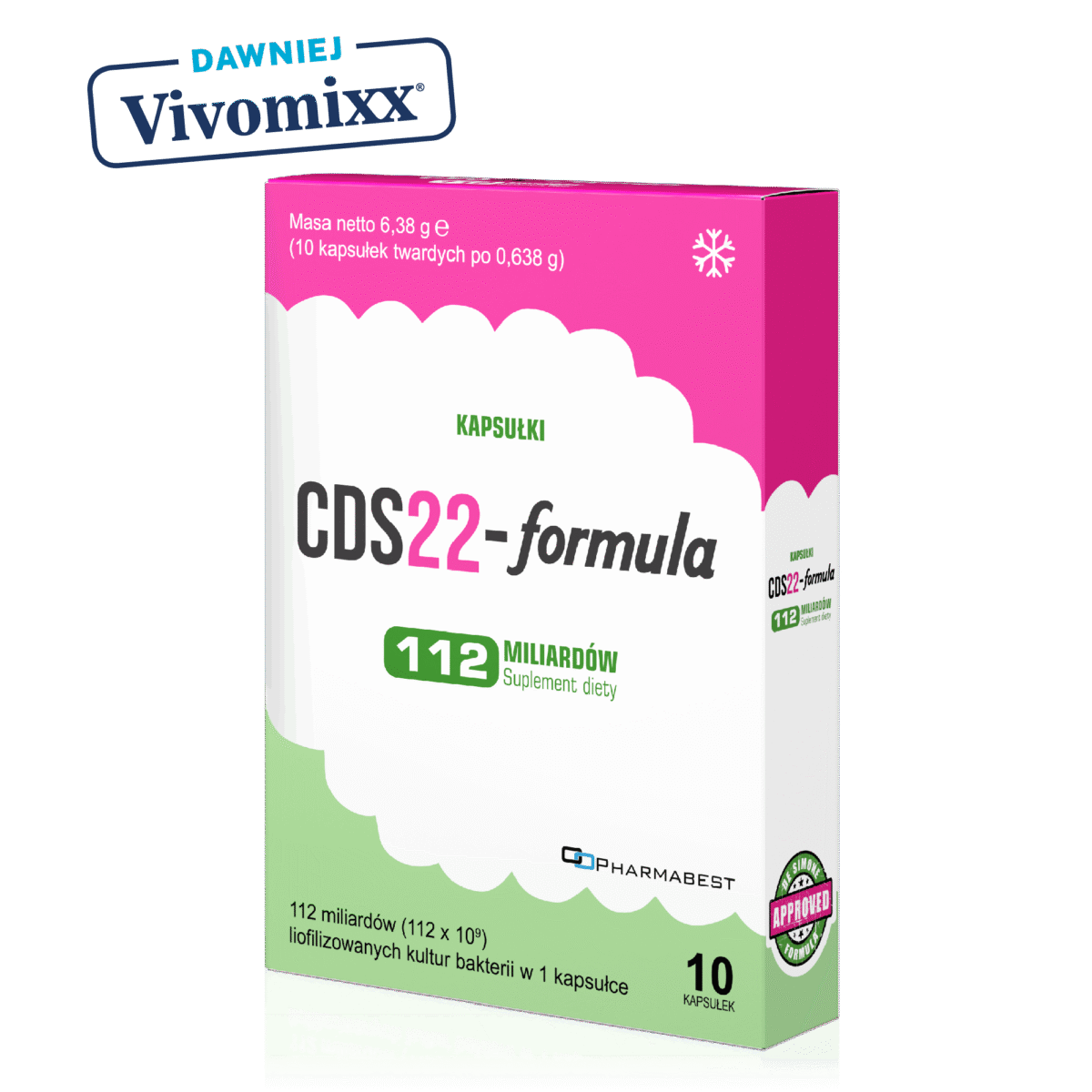 Suplement diety w kapsułkach. Zawiera liofilizat szczepów kultur bakterii probiotycznych – formułę Claudio De Simone (CDS22-formula). Przeznaczony do suplementacji diety niemowląt, dzieci i dorosłych. Kapsułka zawiera 112 miliardów (112 × 109) jednostek tworzących kolonie (jtk.).